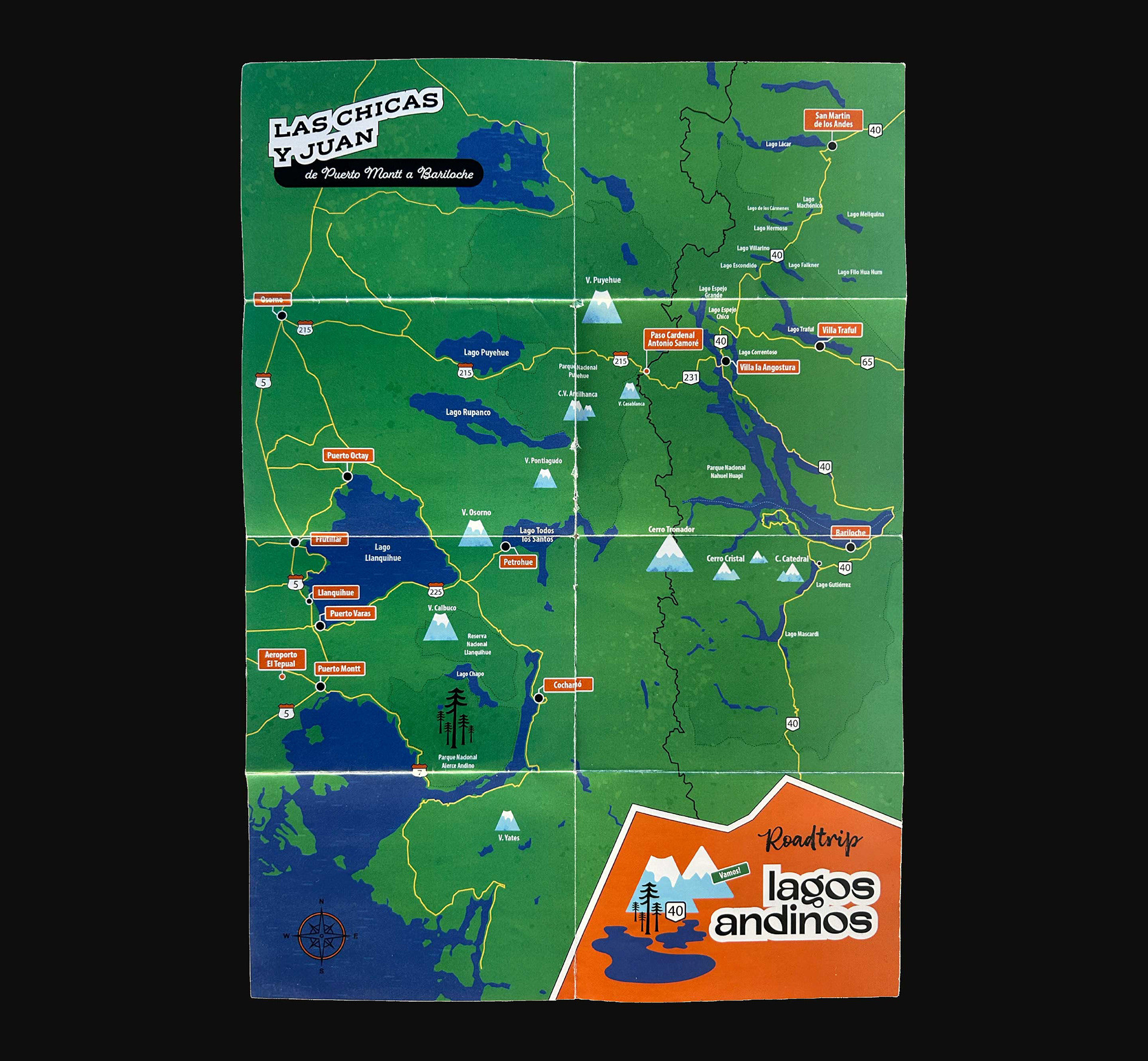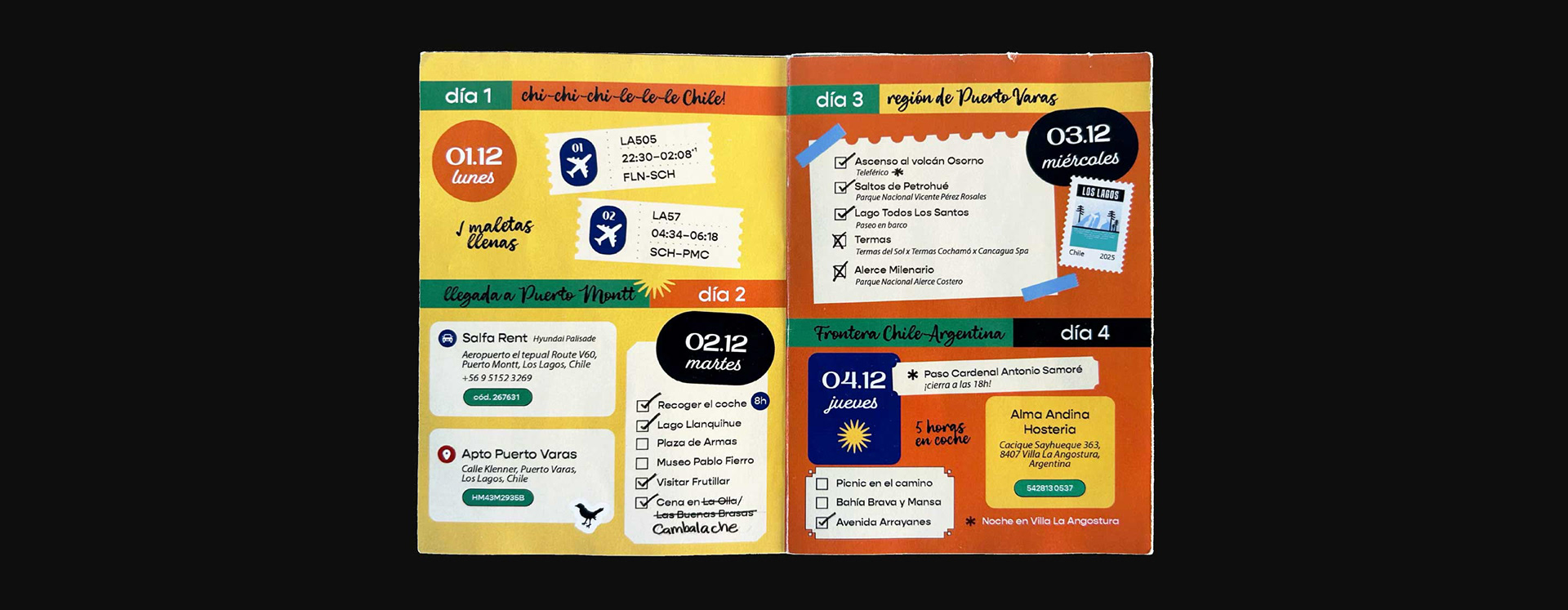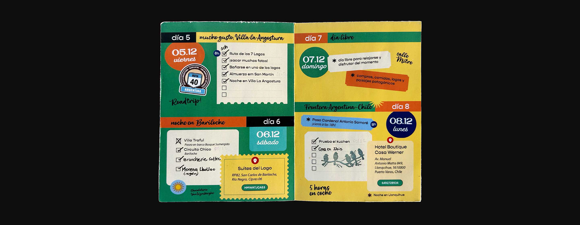 A solução: uma folha A3 dobrada em uma zine de bolso (A6) com 8 páginas. Dentro, incluí nosso roteiro, dados das hospedagens e dicas de passeios e comidas locais para experimentar. No verso, um mapa personalizado traça a rota completa com seus lagos, vulcões e estradas.