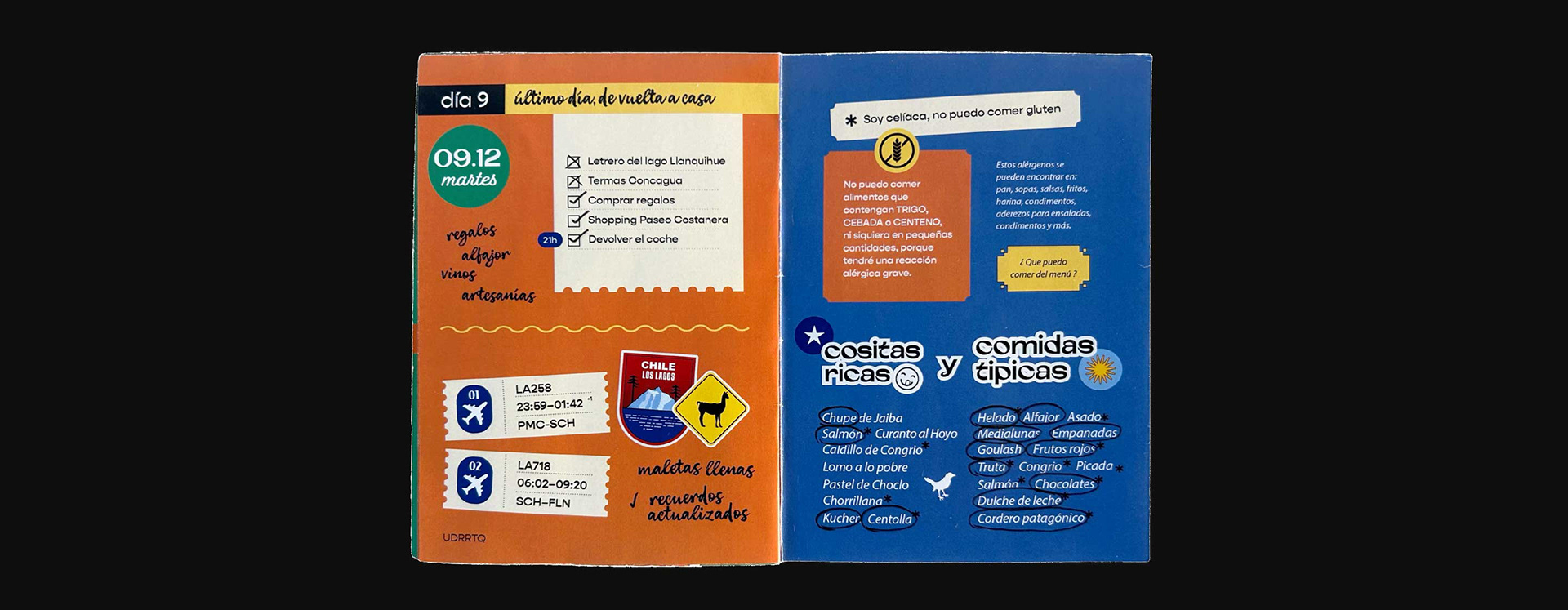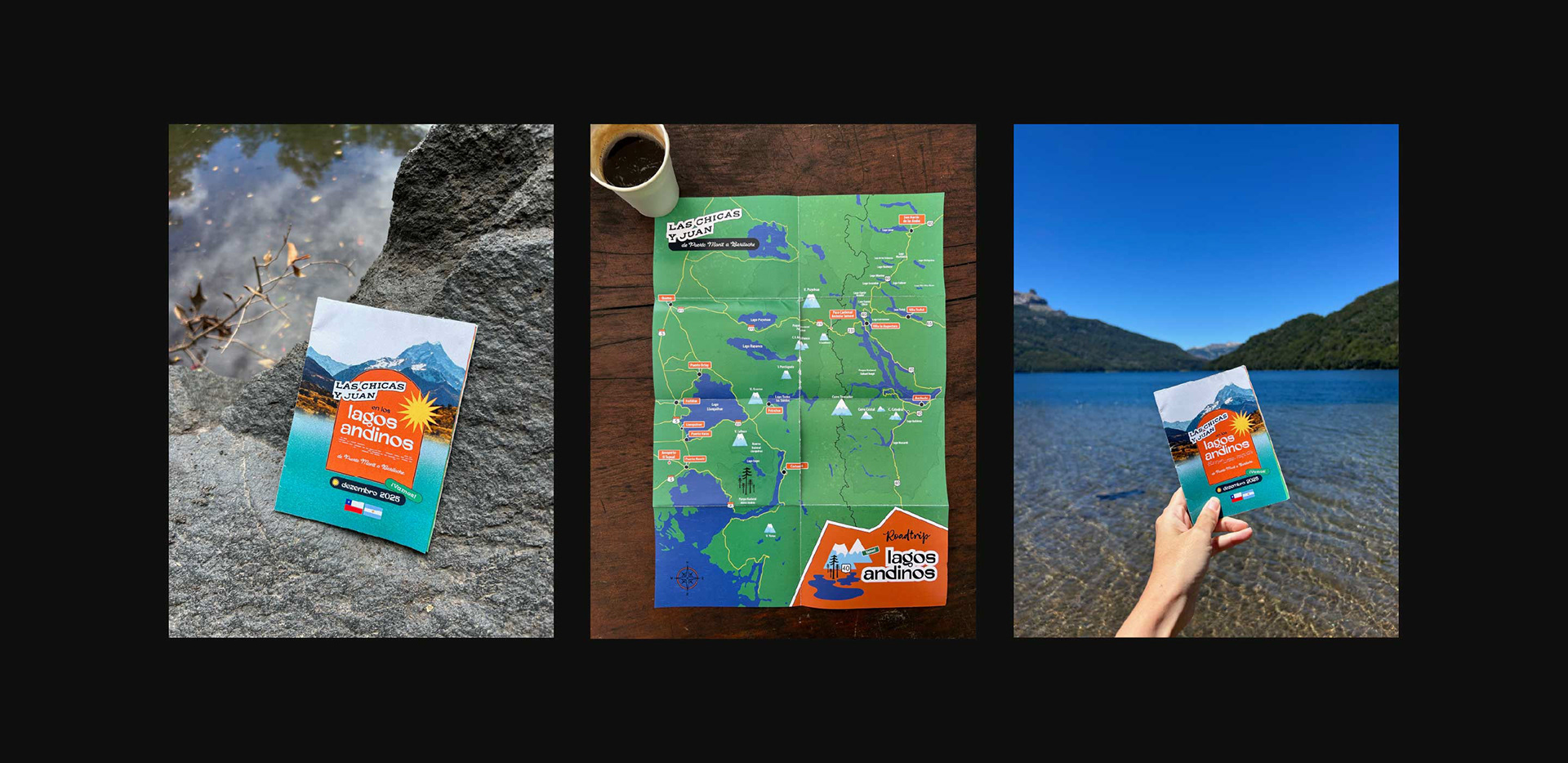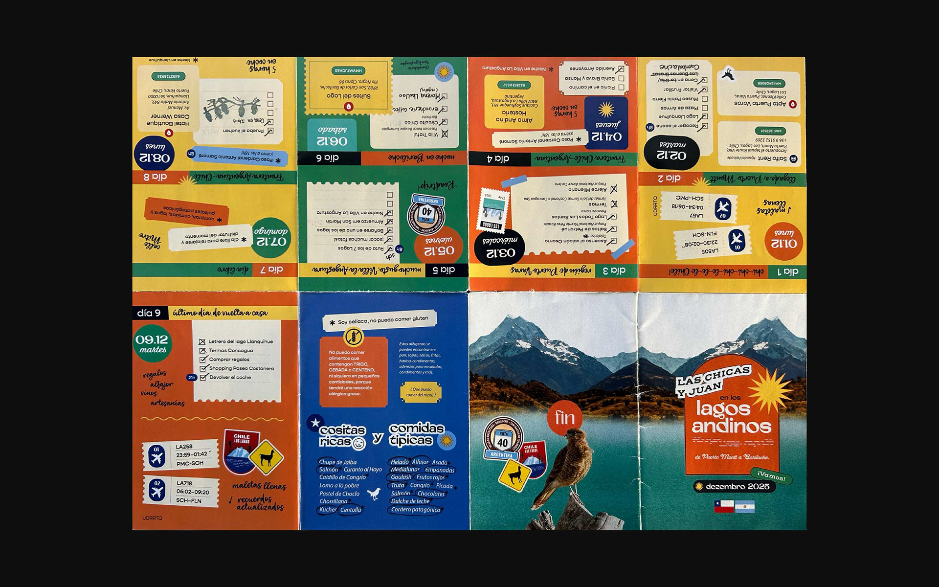 A solução: uma folha A3 dobrada em uma zine de bolso (A6) com 8 páginas. Dentro, incluí nosso roteiro, dados das hospedagens e dicas de passeios e comidas locais para experimentar. No verso, um mapa personalizado traça a rota completa com seus lagos, vulcões e estradas.
